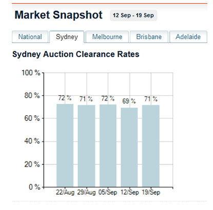 9月19日,悉尼共有832处房产上市拍卖,其中598处拍卖结果报告给domain.com.au。 460处成功售出,另有47处退出不卖。清盘率71%。拍卖售价总额425,778,880澳元,中位价1,080,000澳元。