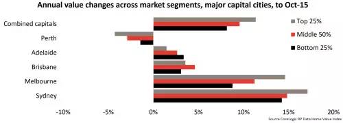 数据显示,截止至2015年10月的过去1年,悉尼低端房产价格上涨14.3%,中端房产价格上涨14.8%,高端房产价格上涨17.1%。