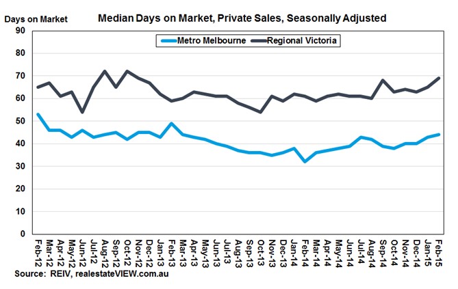 物业在市场上销售的天数是一个评判市场深度的很好指标,也是买家对物业的安全评断。 一般来说, 在市场上存留的时间越长,对卖家降低售价的压力就越大。以下的曲线图表示2015年2月墨尔本市区的物业通常是在44天左右卖掉,有趣的是这是一个长期的平均曲线, 然而却比2014年2月的30天有个上升趋势。 这表明在过去两年房价也不一定有上升。尽管这并不没能代表一个区域的明确需求, 但总的来说底供应区域还是会超过市场趋势。