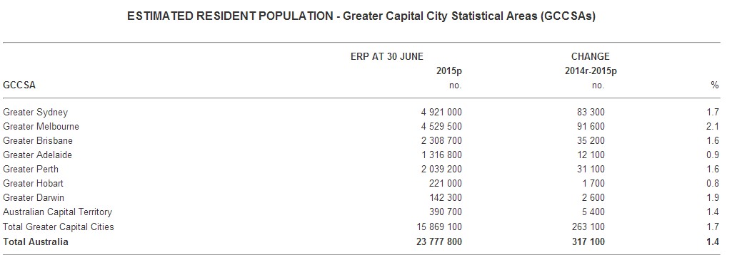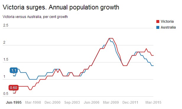 维多利亚州的移民(主要是墨尔本市区)每年都稳定增长。 截止2014年底89%的主要移民是来自海外移民,而州际的迁移是稳定上升。澳大利亚统计局ABS2014年-15年墨尔本增长91600,增长比例为2.1%