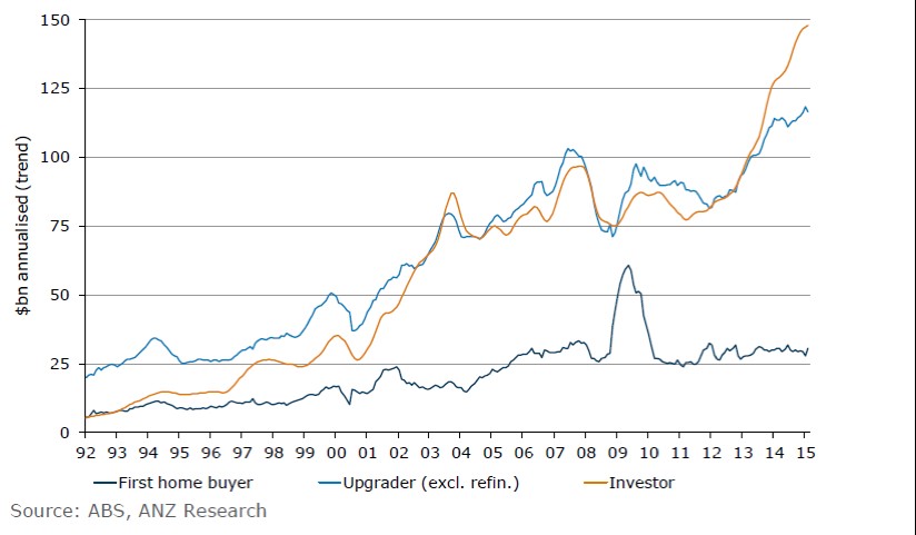 下一个图标表明投资者目前正在购买将近1500亿澳元的房产,比2011年几乎翻了一倍。 改善性购房者也更加活跃,相对首次置业者却相对稳定。