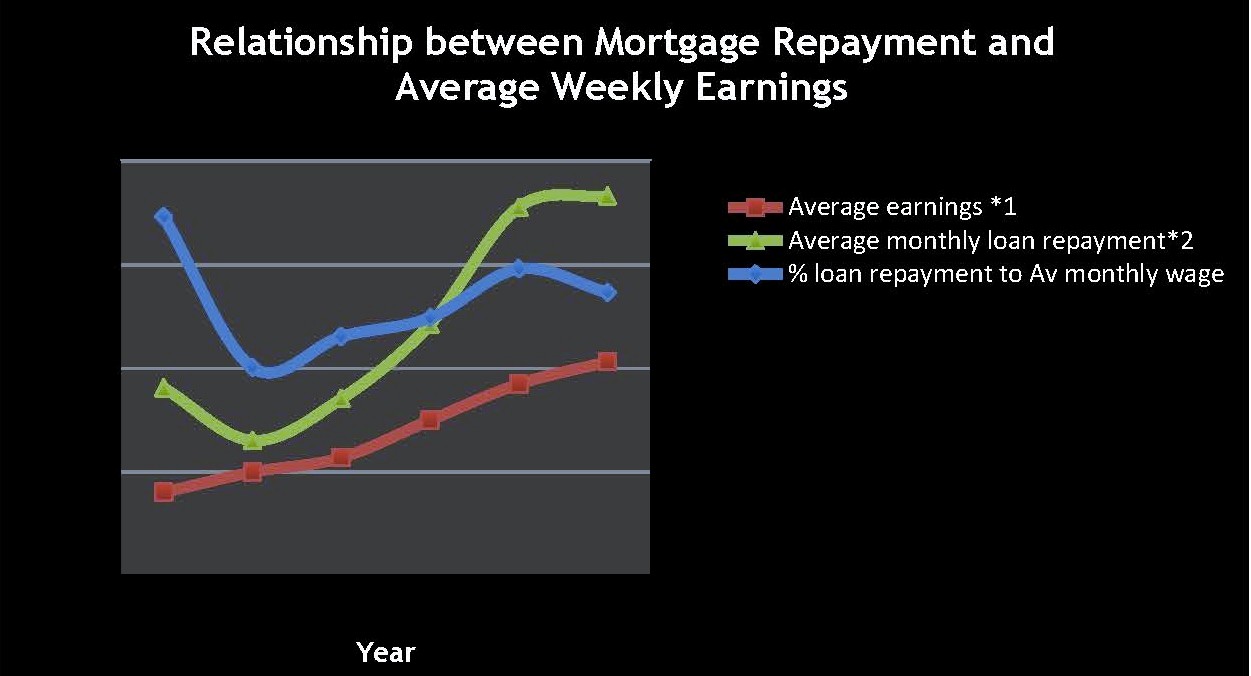 市场萧条最常见的因素是房屋的可购性对平均买家变得不可持续性。 下图表明每年平均收入与贷款70%支付的贷款费用的关系。 蓝线代表满足贷款要求的收入百分比。 这个图标是起始于1990年每5年一个单位, 在1990年平均男性每周50%以上的收入都需要支付贷款。 在1995年时这个百分比下降到30%, 然后稳定的上升知道2010, 达到44%, 而现在是在41%。在过去25年是在39%左右的。