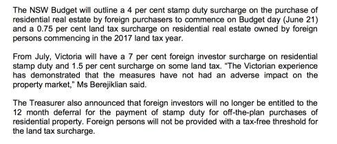 随着维多利亚州(维州,澳大利亚墨尔本所在州)政府成功实施了针对海外人士在维州购住宅房屋征收额外印花税的政策后,悉尼所在的新南威尔士州(新州)政府一直蠢蠢欲动,一直放风要征收额外的针对海外人士的印花税。今天,2016年6月14日,新州财长Gladys Berejikalian正式宣布在将于2016年6月21日公布的州财政预算报告中会针对海外人士购买悉尼所在的新州的住宅房屋,征收额外的4%的印花税,并且将针对海外人士持有新州住宅房屋征收额外的土地税。