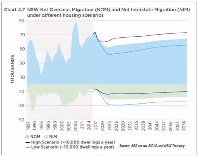 对新州人口增长,特别是对劳动人口增长的预测,是预算案的另一个大重点。到2056年,新州总人口预计将达到1,120万人。这比现在760万人口多将近50%,比1976年的500万人口更是多出两倍。370万新增人口里,200万则将是由于自然增加——自然人口出生以及人均寿命的延长。另外的170万则是净移民人口的增加。在接下来的40年里,预计平均每年净移民将超过41,000人,它是每年海外移民(60,000人)抵消州际移出人口(19,000人)而成。