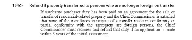 如果在交易时交付过额外税(surcharge purchaser duty)——即4%额外印花税(4% stamp duty surcharge),而在最初评估的5年之内,主要委员(chief commissioner)认为交易双方都不再是海外人士的,则主要委员(chief commissioner)应重新评估或退还所交的额外税。