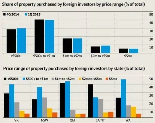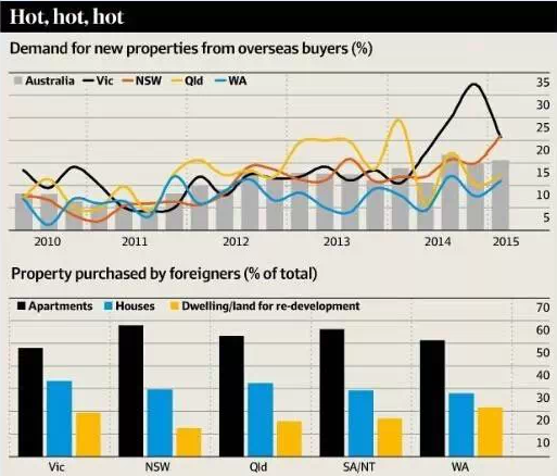 其中,海外买家在维多利亚州,尤其是墨尔本地区的房屋购买房屋比例较去年有所下降,具体从2014年的33.33%下降至今年第一季度的20%。