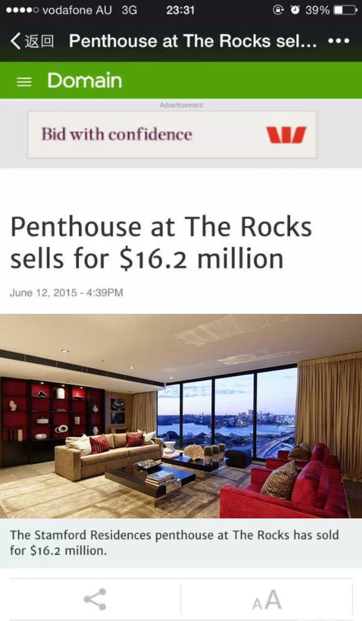 悉尼岩石区(The Rocks)一套三层的豪华公寓近日被一位中国买家买走。据透露,该豪宅的售价高达1620万澳元,根据房屋产权记录显示,上述中国买家为章泽天 (Zhang Zetian),与京东商城创始人兼首席执行官刘强东的女友“奶茶妹妹”同名,但目前尚不清楚这位中国买家是否为“奶茶妹妹”本人。