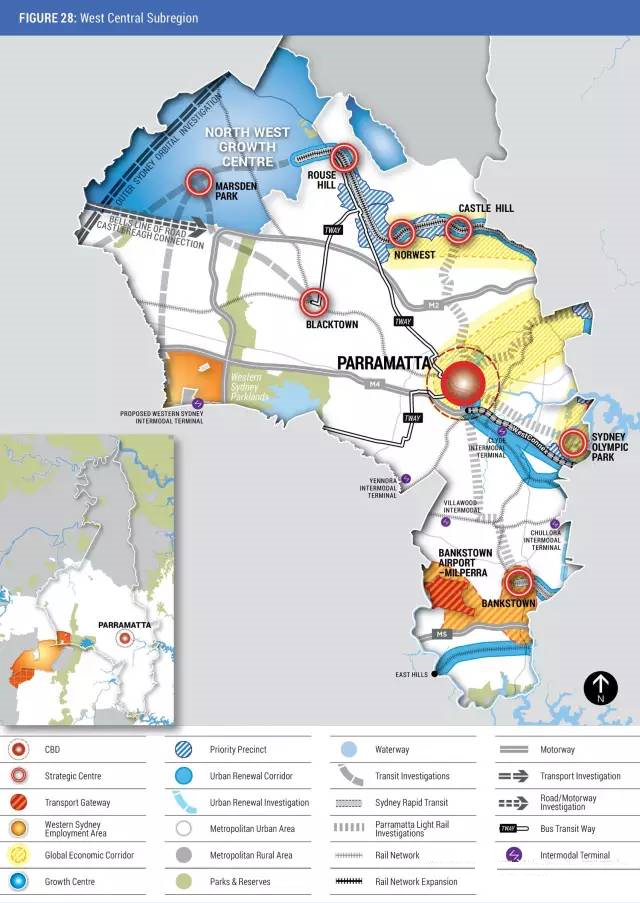 全球经济走廊。州政府沿着悉尼东南、穿过悉尼市中心、延伸至悉尼西北和西部,划了一条全球经济走廊。这条走廊将连接CBD与Parramatta及西北就业 中心,接下来有可能延伸至Liverpool及新机场。Parramatta Council及North Sydney Council已经根据全球经济走廊的策略引领了一些列规划升级。这条走廊将会是政府未来增加政府投资、基础建设及城市增长的焦点区域。