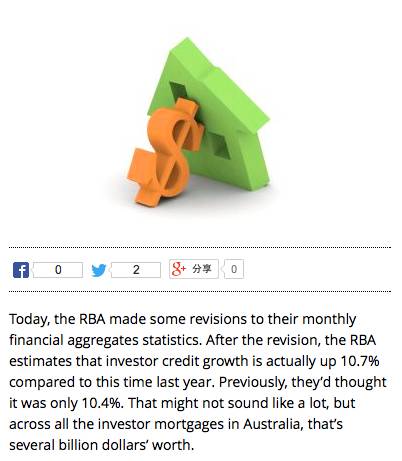 周五,澳联储称,月数据显示,房产投资信贷增长已经超过了监管机构10%的限定,必须严格执行此标准。在澳新银行(ANZ)重新确认上交给APRA(澳洲审慎监管局)的数据后,澳新银行的的投资借贷增长比之前多了200亿澳元。澳新银行的财物报表并没有受到影响,但数据变动后,房产行业的整体借贷增长就增加了。之前,澳联储称,截至五月,投资借贷的增长为10.4%,然而现在最新的数据显示,借贷增长加快了,从1月以来的10.3%上升到了现在的10.7%。