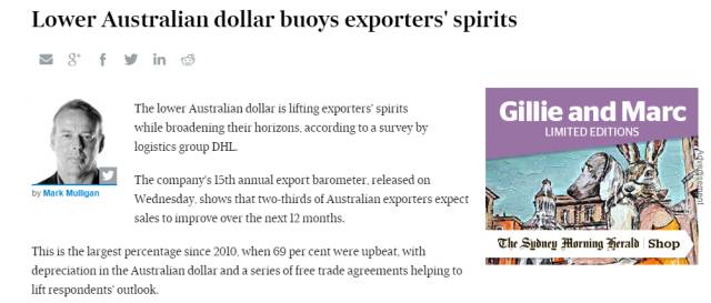 根据物流集团敦豪速递公司(DHL) 的一份调查,贬值的澳币正鼓舞出口商的士气,并拓展了它们的发展视野。