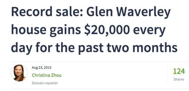 澳洲《时代报》8月23日房产头版报道,周六,位于墨尔本Glen Waverley一栋三卧室老房屋在拍卖时,以600万澳币的高价被卖出,创造了该区最贵房产记录,也创造了房子增值最快速度,平均每天20000澳元上涨。。