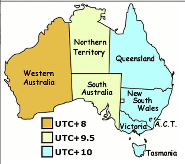 众 所周知,澳大利亚幅员辽阔,境内也因此出现了三个时区:东部标准时间(EST),包括新南威尔斯州、澳大利亚首都领地、维多利亚州、塔斯曼尼亚州和昆士兰 州;中部标准时间(CST)包括南澳大利亚和北领地;西部标准时间(WST)包括西澳。中部标准时间比东部标准时间慢半小时,西部标准时间则比东部标准时 间慢2小时。