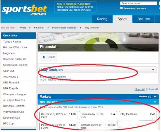 这次突破性的低点,震惊全澳。甚至澳洲著名的在线赌博网站sportbet.com也对央行的利率政策开了一个赌局!